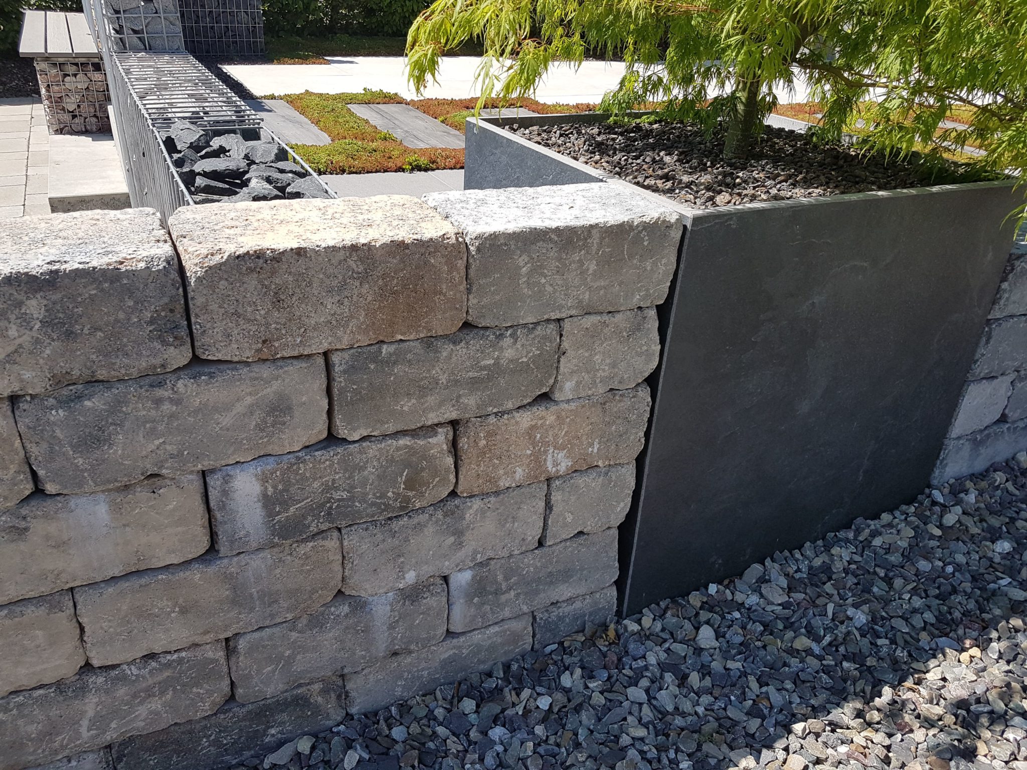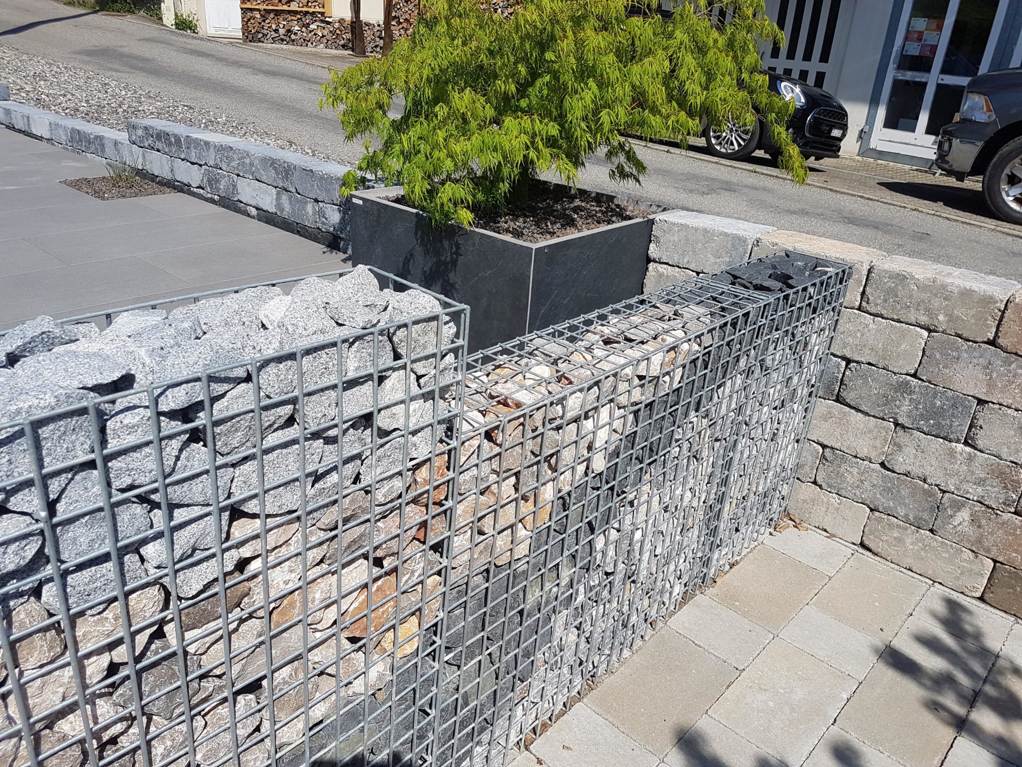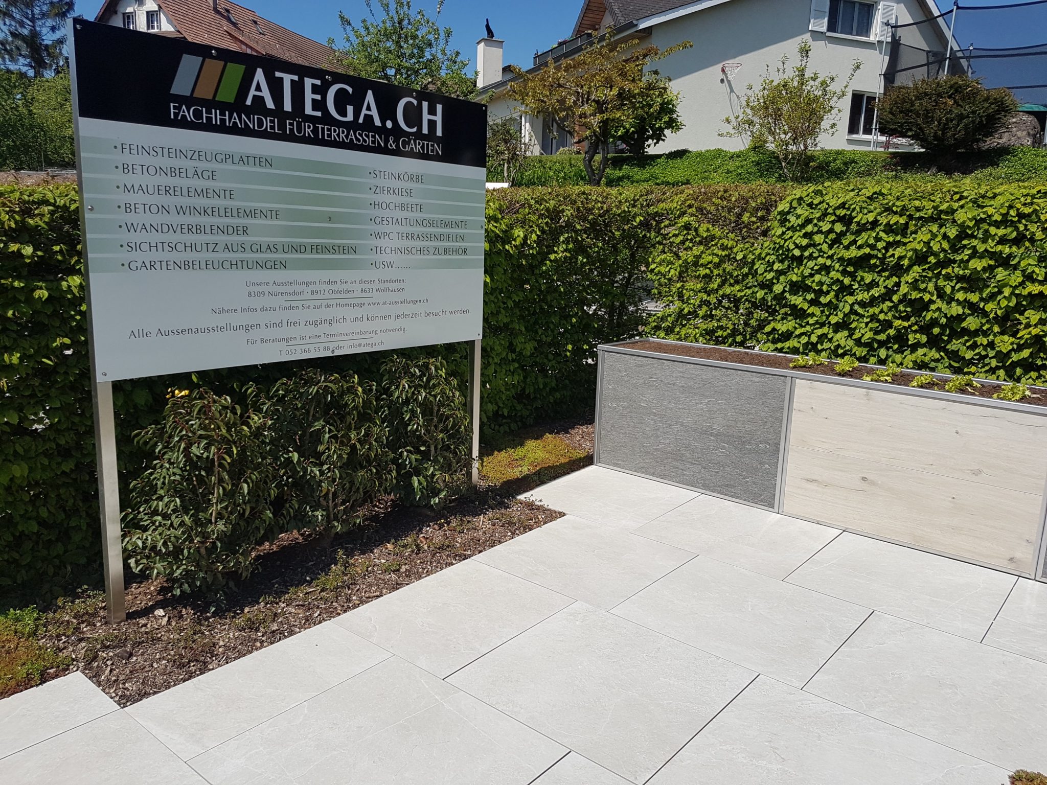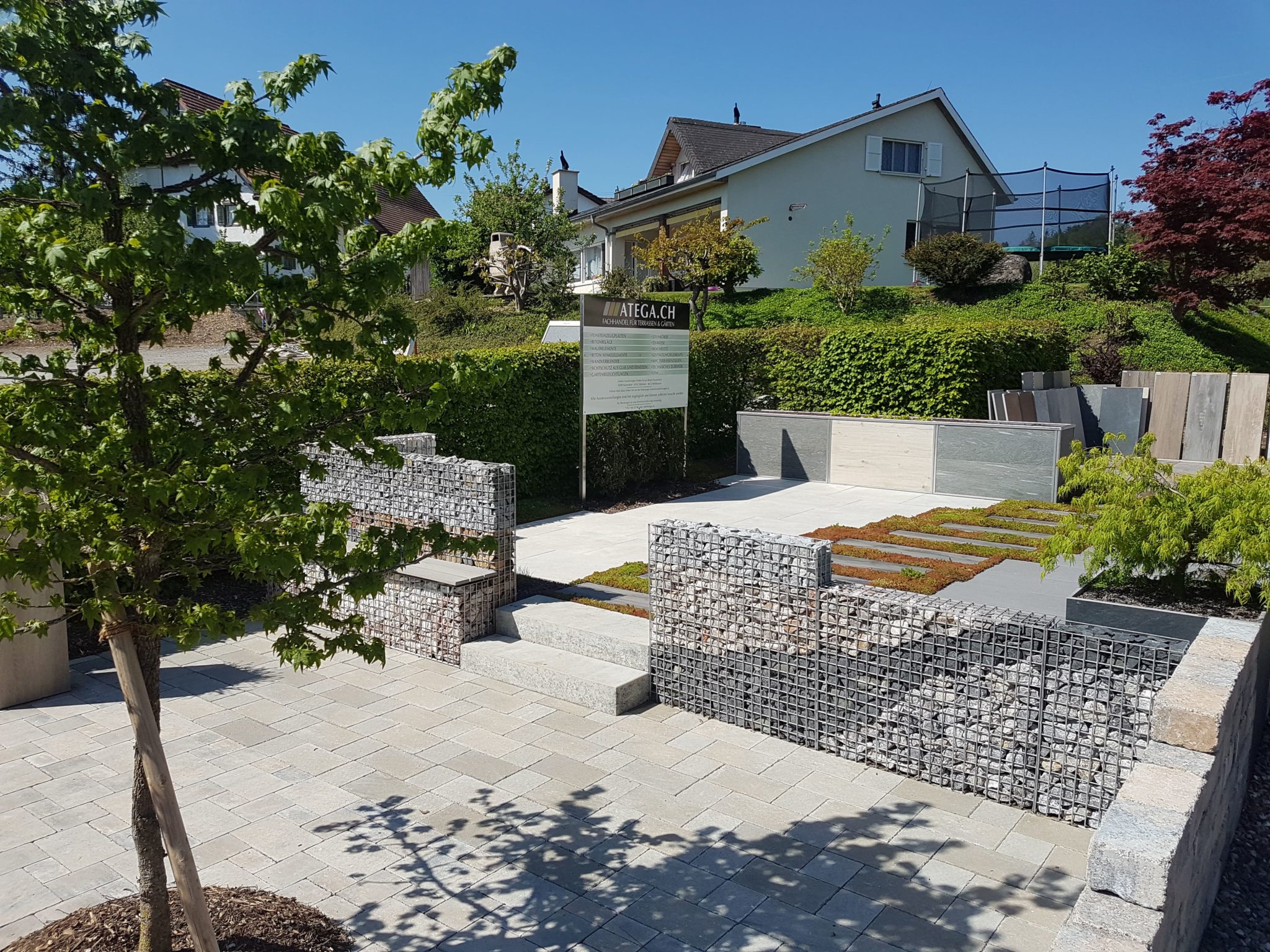 In unserer kleinen Aussenausstellung ist ein Teil unserer Produkte ausgestellt. Hauptsächlich finden Sie Feinsteinzeugplatten für den Aussenbereich, Betonpflaster, Steinkörbe, Tonpflasterklinker, Sichtschutz und Zierkies.
