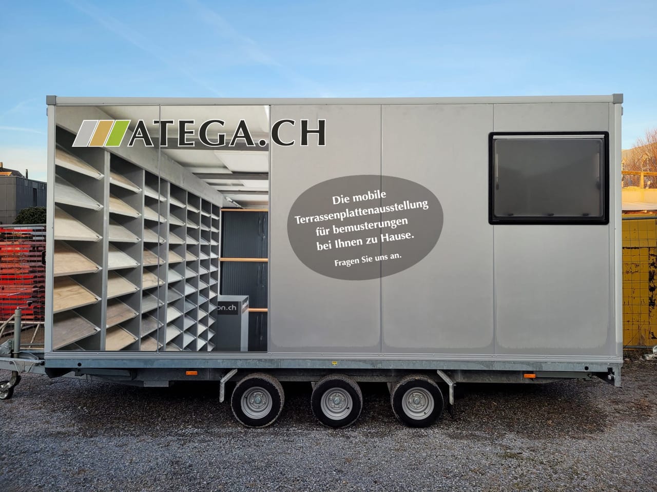 Unser neuer Bemusterungsanhänger hat über 200 verschiedene Plattenmuster dabei. Durch einen kleinen Aufpreis können Sie direkt vor Ort bemustern und die Auswahl mit den bestehenden Materialien vergleichen.